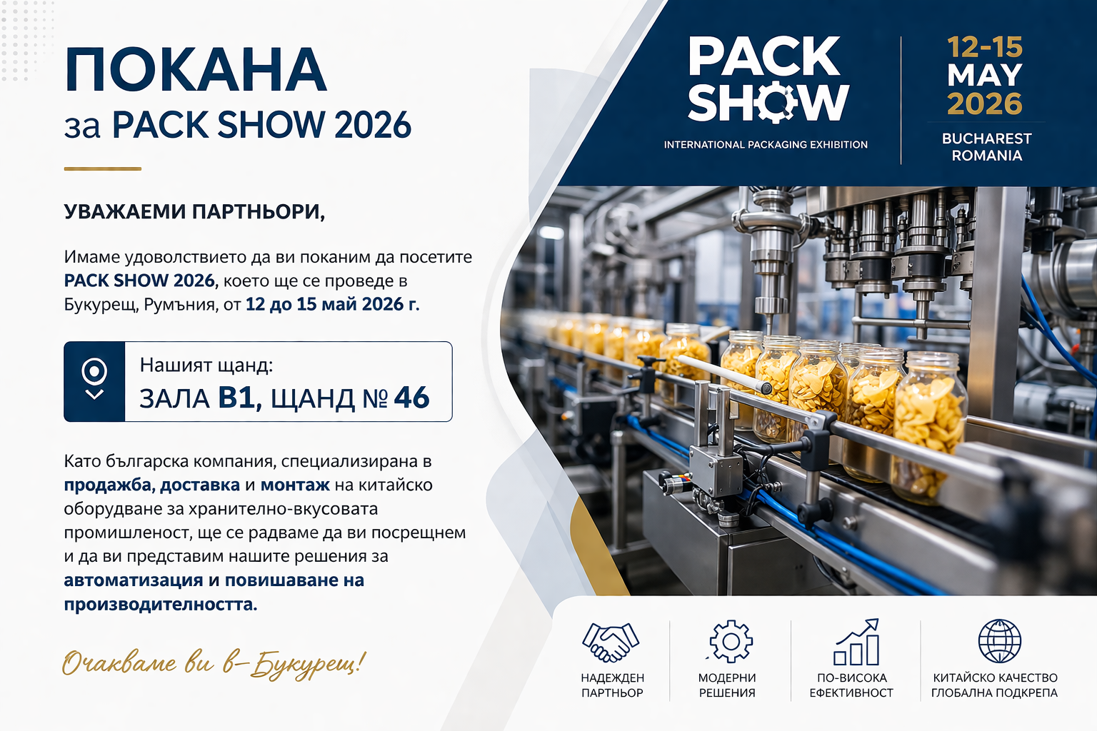 Нашата компания се занимава с избор и доставка на оборудване и резервни части от Китай. Ние работим само със заводи, които имат сертификат за износ на продукция за чужбина. Всичкото доставено от нас оборудване има гаранционно и след гаранционно обслужване. Предлагаме синхроблоки, изплакващи машини, пълначни машини, затварящи машини, етикитиращи машини, фолиращи машини, опаковъчни и пакетиращи машини, консервни, за сладкарство и хлебарство, фармация и месопреработка, транспортни системи, машини за монтаж картонени кутии и др.